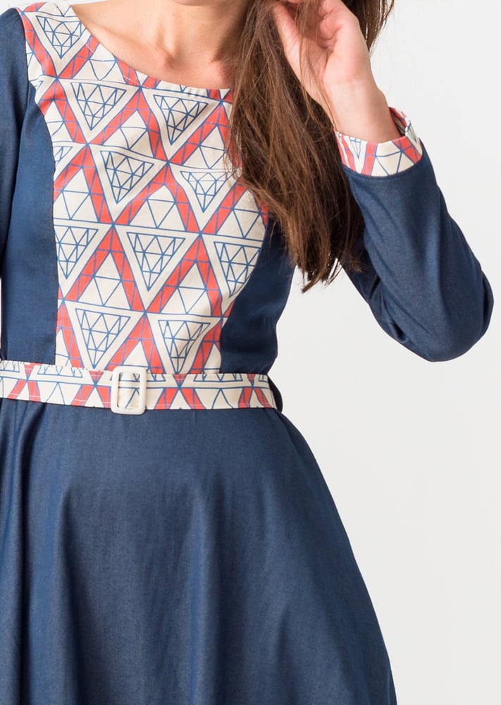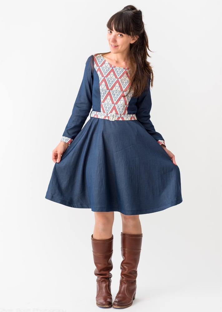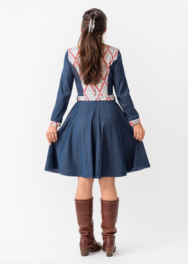 Nothing quite like a dress with pockets! This dress is made from a soft drape denim fabric and showcases a graphic diamond print in the bodice center. Long sleeves with contrasting cuffs in the same diamond print. Princess seams make up the shape of the bodice and is complimented with a full circle skirt with inset pockets. A 22 inch zipper in the back gets you in and out of the dress with ease.