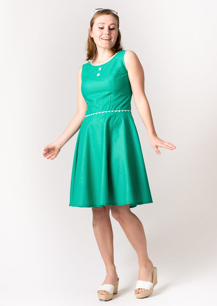 Ahhh yes... love me some polka dots! This little party dress is made from a green polka dot cotton fabric and features white scallop ric-rac trimming at the neckline and waist. Two white buttons add detail to the front bodice. Enjoy twirling around in it's full circle skirt! A 22 inch zipper gets you in and out with ease. 100% cotton. Hand wash cold and line dry.