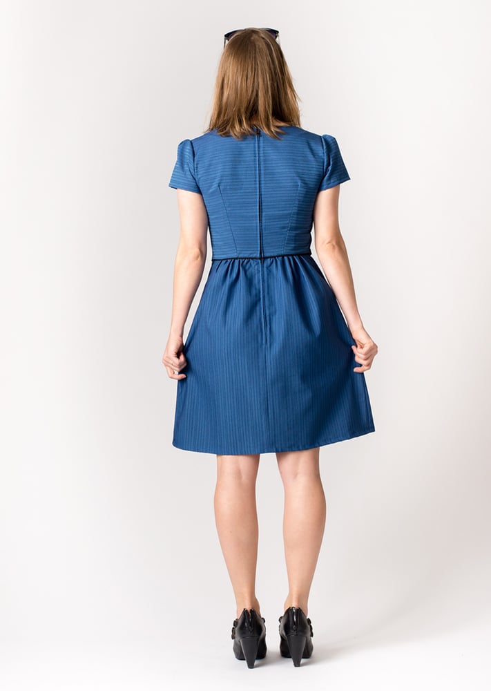 The skirt is slim fitted, aline with gathering at the waist in the front at back, but not on the sides - so as not to add extra volume to what is already naturally the widest part of your body. Darts at the bust and in the back. A 22 inch zipper gets you in and out of the dress with ease.