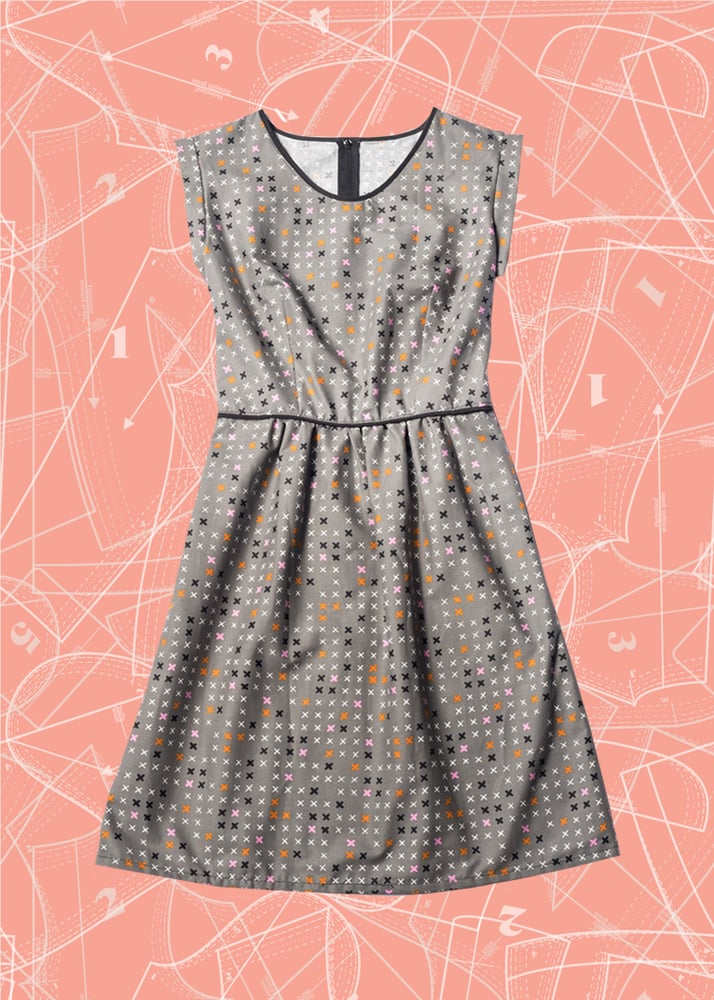 This dress showcases an "X" print on a silver/gray background. It has a rounded neckline that features contrast black pipping at the waist and black binding around the neck. The skirt is slim fitted, aline with gathering at the waist in the front at back, but not on the sides - so as not to add extra volume to what is already naturally the widest part of your body. Darts at the bust and in the back. Cap sleeves. A 22 inch zipper gets you in and out of the dress with ease.