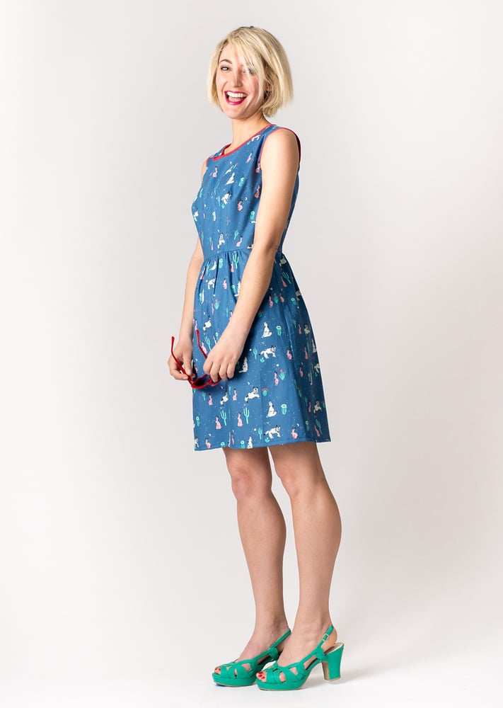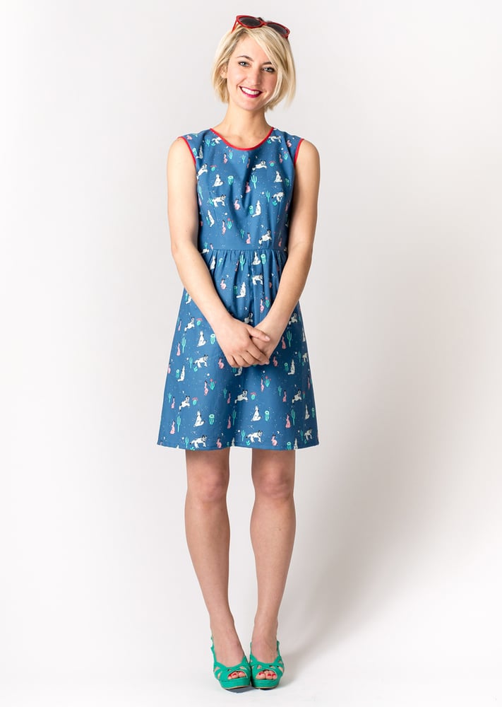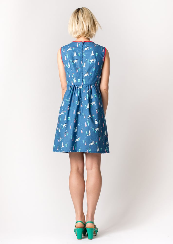 The dress has a rounded neckline that features contrast red binding around the neck and can also be find at the armholes. The skirt is slim fitted, aline with gathering at the waist in the front at back, but not on the sides - so as not to add extra volume to what is already naturally the widest part of your body. Darts at the bust and in the back. A 22 inch zipper gets you in and out of the dress with ease.