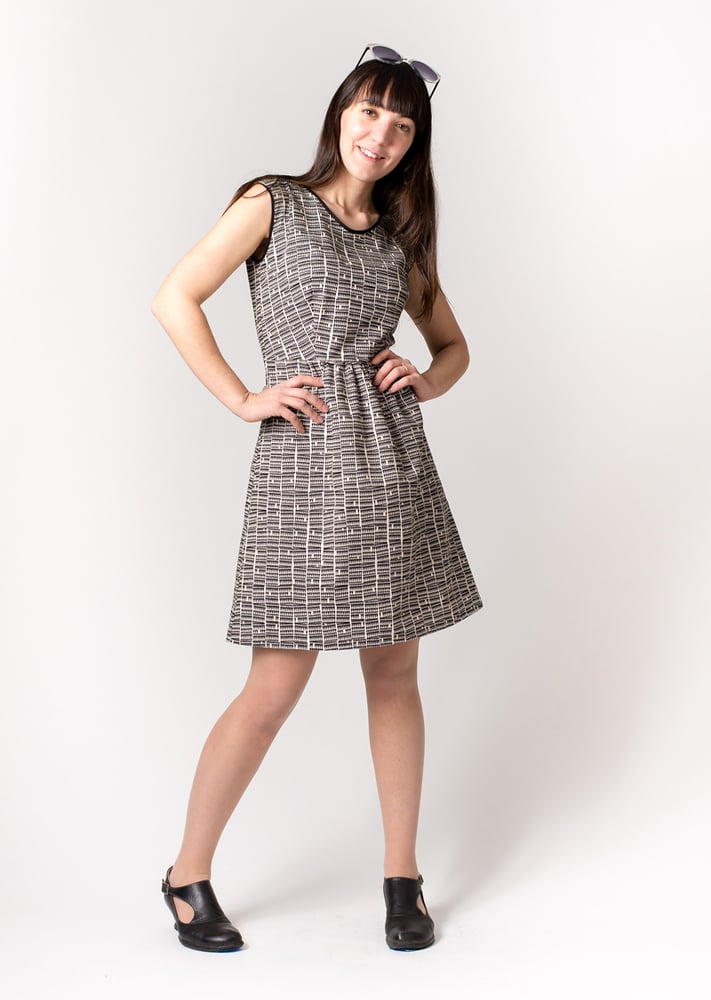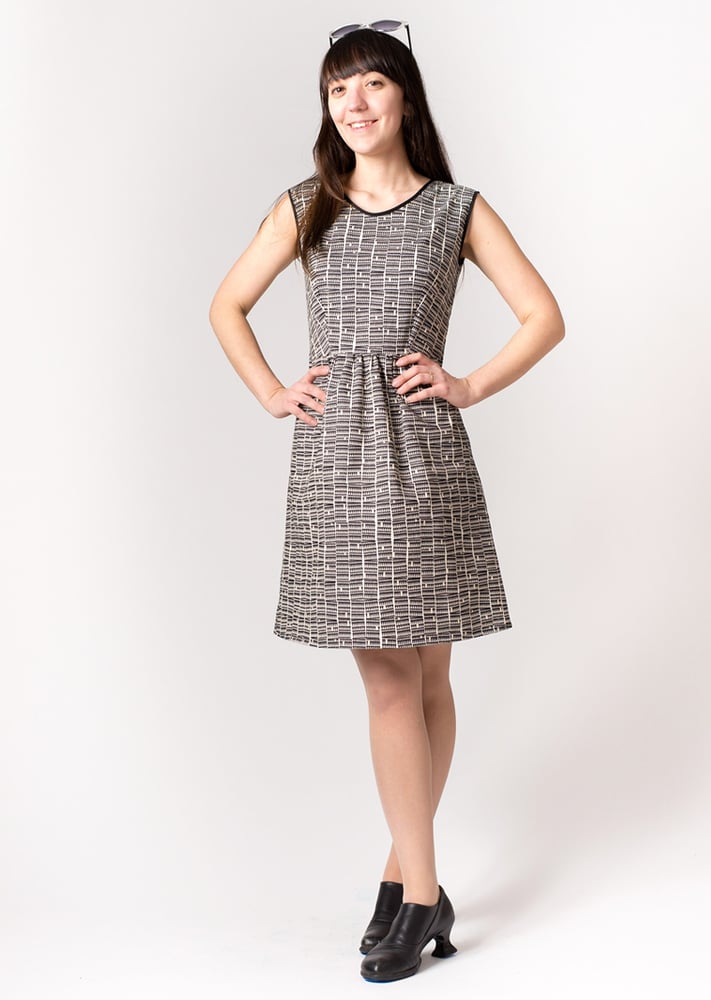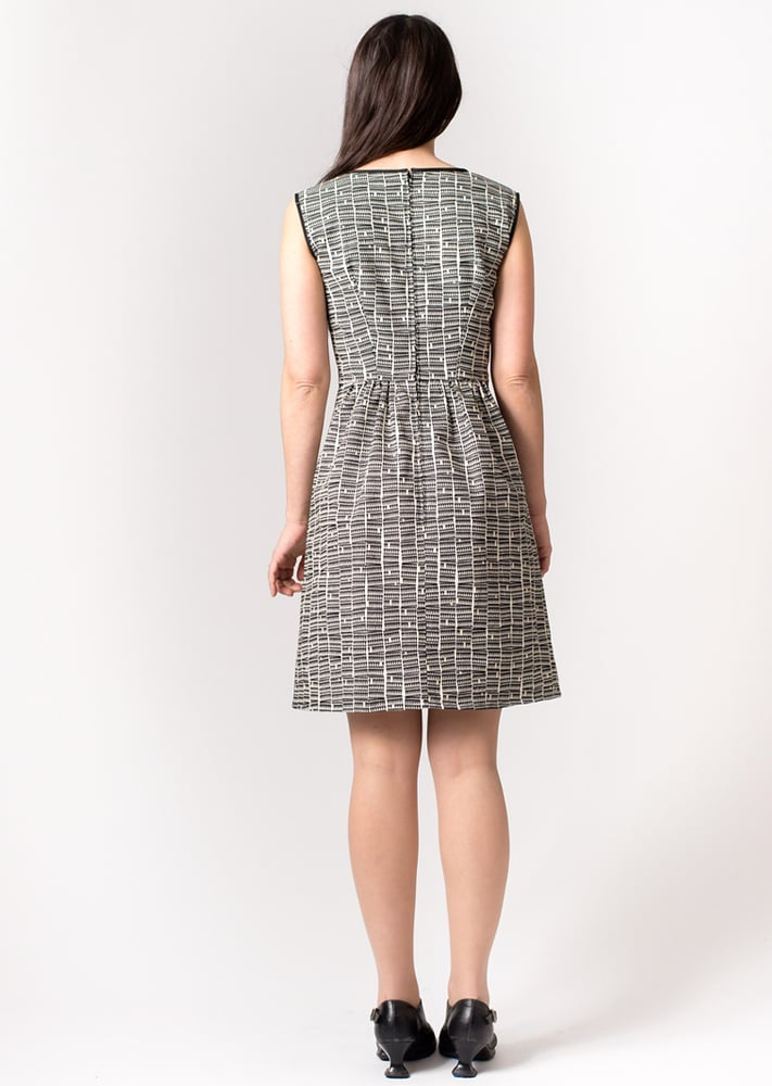 Here are the details: The skirt is slim fitted, aline with gathering at the waist in the front at back, but not on the sides - so as not to add extra volume to what is already naturally the widest part of your body. Darts at the bust and in the back. Contrast black piping around the armholes and neckline. A 22 inch zipper gets you in and out of the dress with ease.