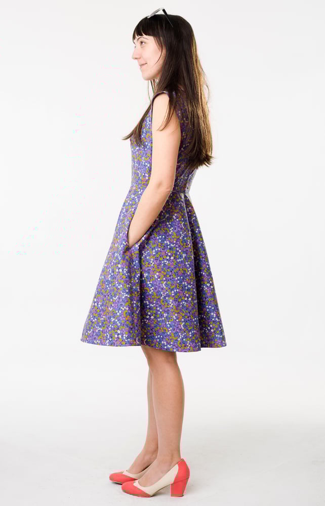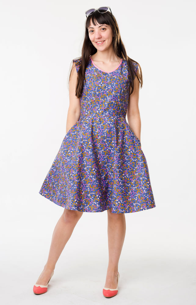 The Sally dress combines the bodice from the Roxy dress with the skirt from the Coco Dress giving you a fun and fabulous fit and flare look. Rounded neckline with pink contrast binding and cap sleeves. Full circle skirt sits at natural waist and has pockets! Darts at the bust and in the back. A 22 inch zipper gets you in and out of the dress with ease.